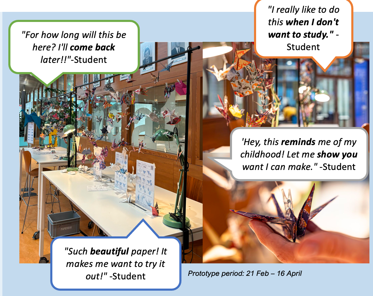 The first physical intervention was the Origami activity. Students mentioned that they wanted to have short breaks, but still being creative or using their brain differently. This prototype was a huge success with the students.
