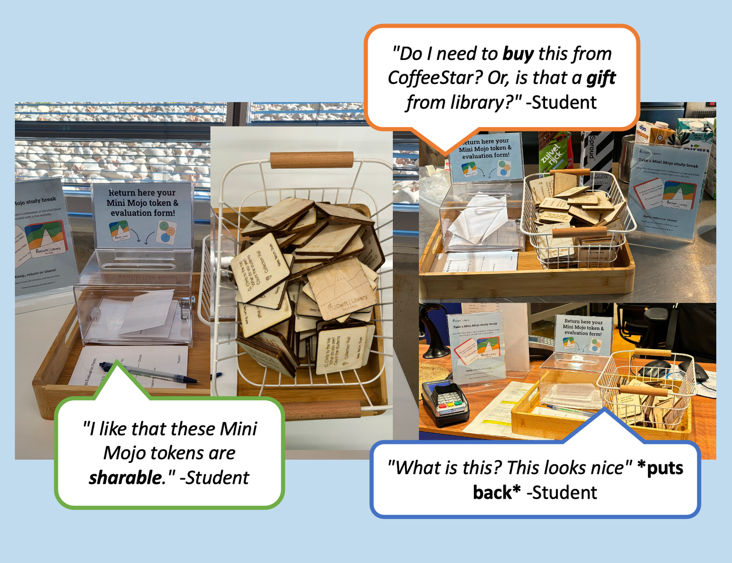 The second intervention called Mini Mojo were small activities lasercutted on wooden cards. With this intervention the idea was for students to explore the Main Hall in fun and playful way. These cards were placed were students frequented. Activities related to knowledge, mindfulness, taking breaks were and community were the most popular.